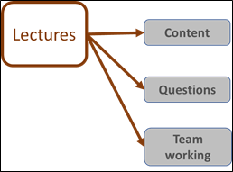 So, for example a typical ‘lecture’ is rarely a 50 minute monologue. Rather, most lectures I have observed contain elements of content (didactic teaching), questions (posed by the lecturer for the students to answer), and teamwork (working with peers on class exercises).
