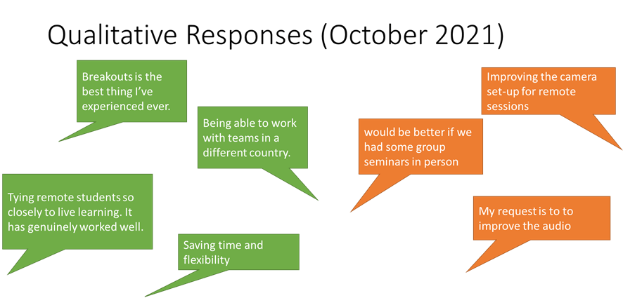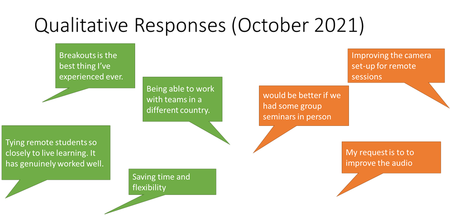 Students (particularly those remote, or in quarantine) genuinely appreciated the effort made to involve them in the class. The flexibility was also appreciated by students, one of whom attended online ‘because they got up too late’ – whether this behaviour should be encouraged is of course debateable, but my view is that this student most likely would have skipped class otherwise, whereas instead I welcomed them to the class and included them in discussion.